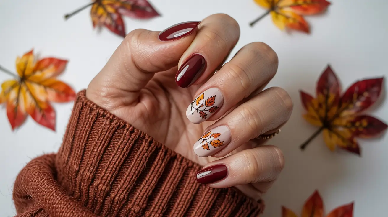 Ce design coche clairement toutes les cases du nail art automne 2025 : une palette chaude, un motif végétal, et une mise en scène qui respire l’automne cosy. On imagine bien cette manucure assortie à un pull torsadé et un pumpkin spice latte.