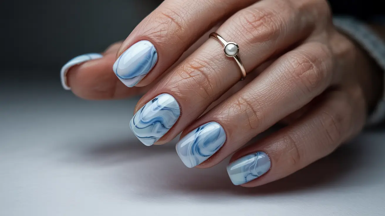 Le marbré bleu est tout simplement hypnotique. Il évoque l’océan en plein cœur de l’été, et c’est une des tendance ongles été 2025 qui me séduit complètement. L’effet marbré donne cette impression de pierre précieuse ou de cristal taillé, parfait pour celles qui veulent un look plus mystérieux et original.