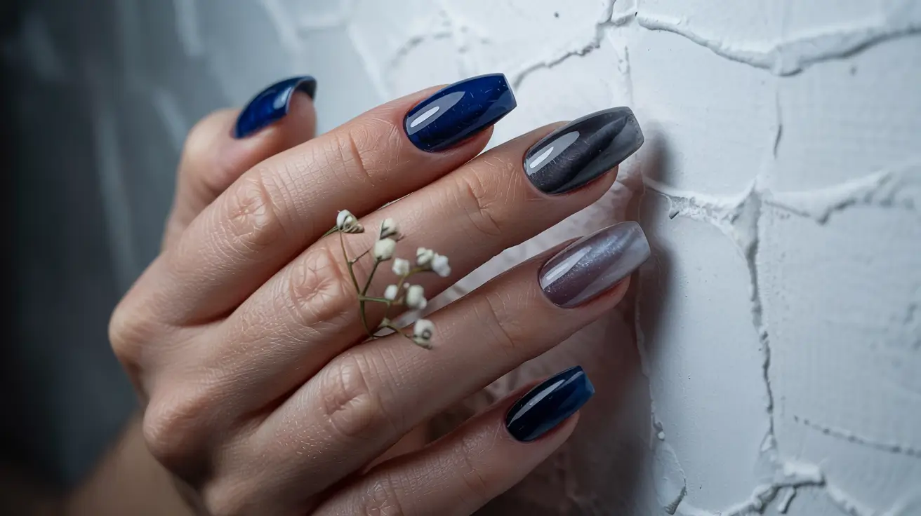Enfin, un look que j’adore appeler « Blue Frost ». Ce mélange de gris glacier, de blanc cassé et de bleu doux est parfait pour celles qui aiment les looks minimalistes et frais. C’est une manucure hiver 2025 qui respire l’élégance nordique.