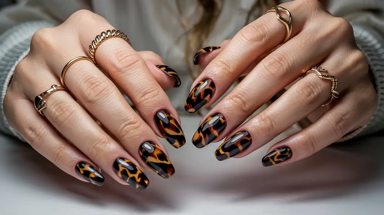 C’est LA manucure statement. Le motif écaille de tortue, fondu dans des tons caramel et brun, est associé à du nude et un noir intense glossy. Un accent doré vient souligner le tout, pour un effet bijou. C’est sans doute la version la plus luxueuse de la manucure léopard 2025, flirtant avec les inspirations joaillerie.