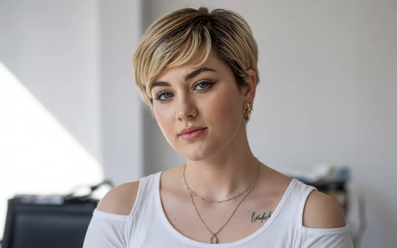 Ce pixie très aéré, presque « effleuré », joue avec les volumes au sommet du crâne pour allonger la silhouette du visage. Le blond miel légèrement ombré booste l’éclat naturel de la peau. C’est une coupe pour visage rond et gros qui assume son côté pétillant et lumineux.