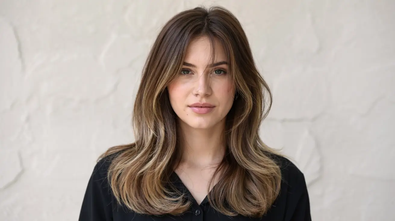 Idéal pour les visages ronds ou en cœur, cette frange rideau dégradée cheveux longs adoucit les traits tout en laissant respirer le visage.