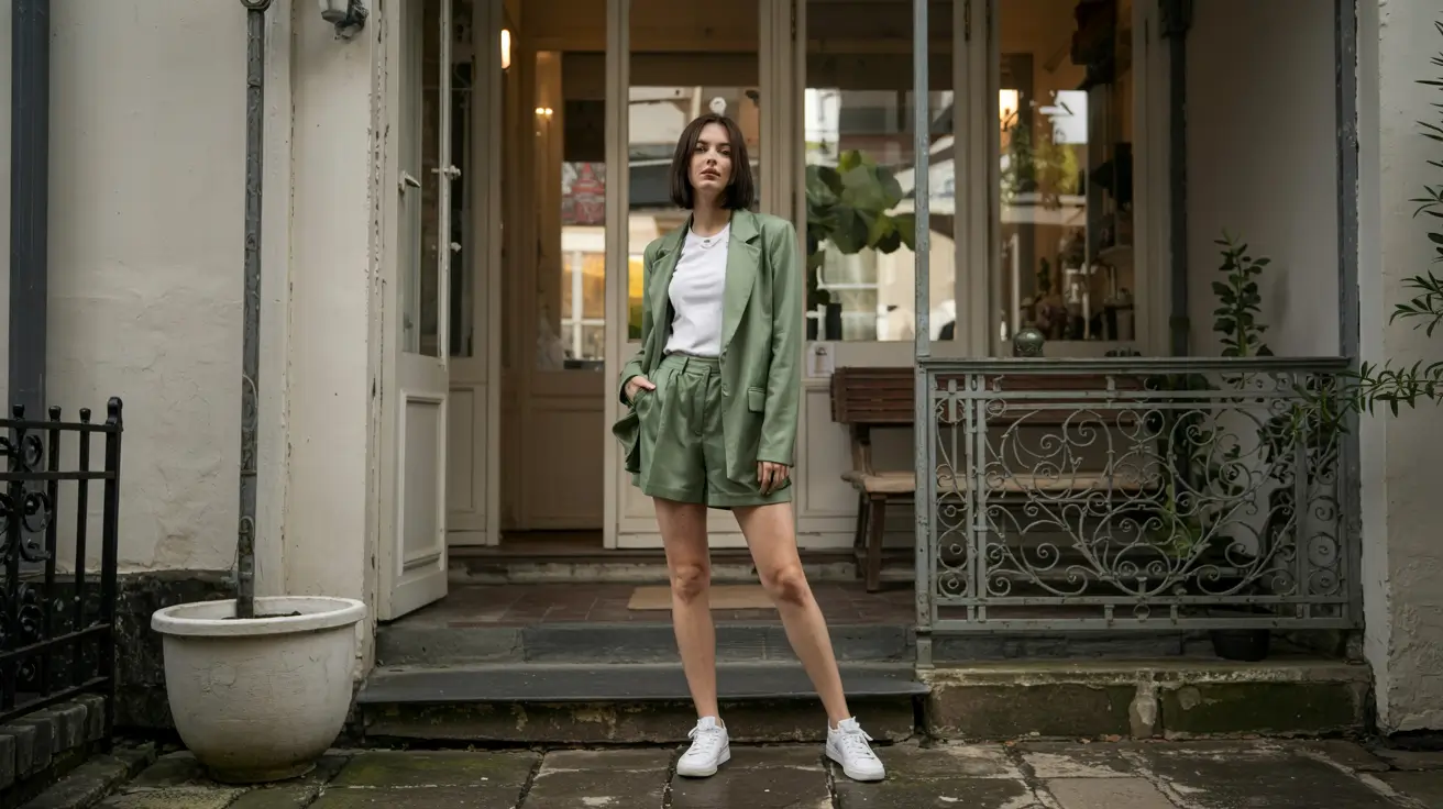 Tailoring revisité : l’ensemble blazer-short couleur sauge