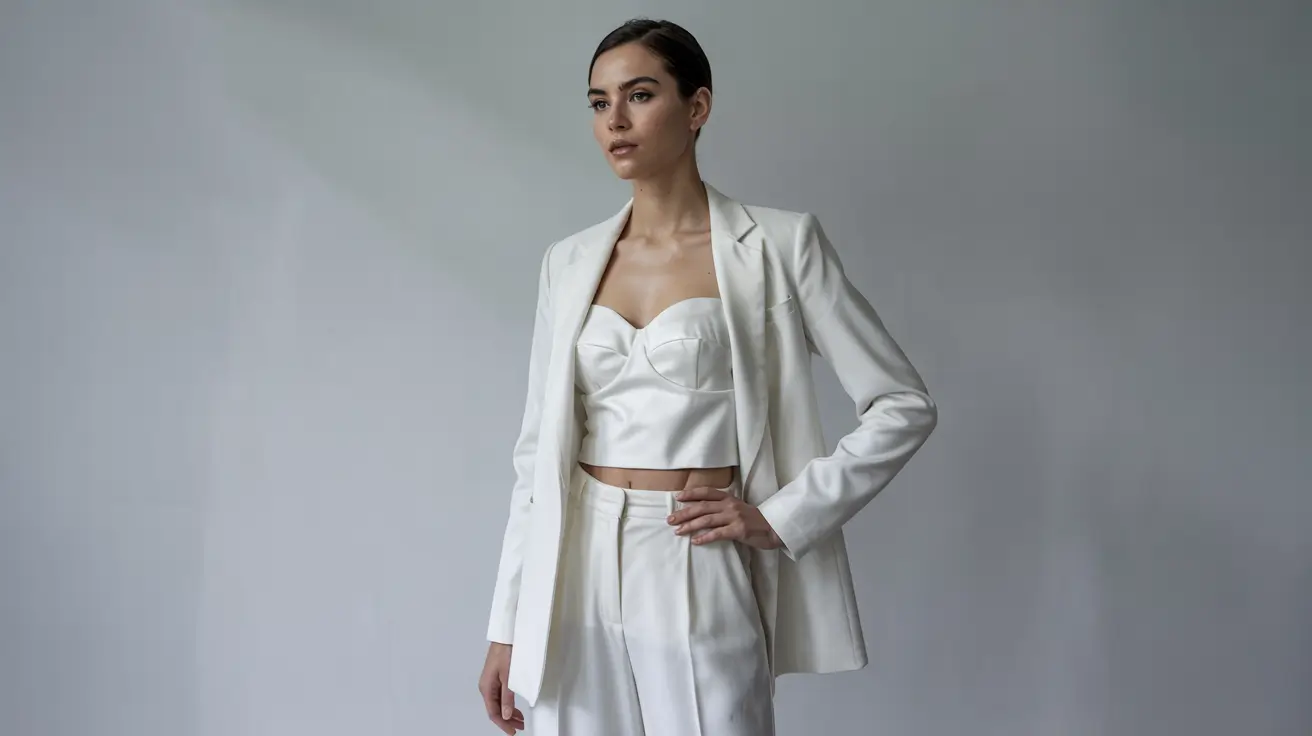 Cette tenue me rappelle un mariage auquel j’ai assisté à Miami — la mariée portait un tailleur avec bustier dans ce style, et tout le monde pensait qu’elle sortait tout droit d’un défilé. Depuis, j’ai toujours un œil sur ce genre de pièces pour les grandes occasions.